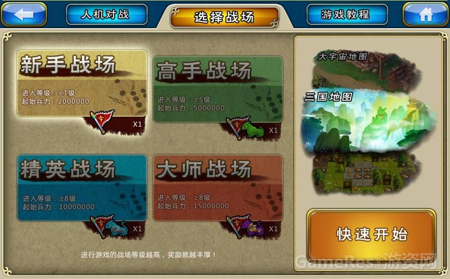根据兵力:新手、高手、精英、大师