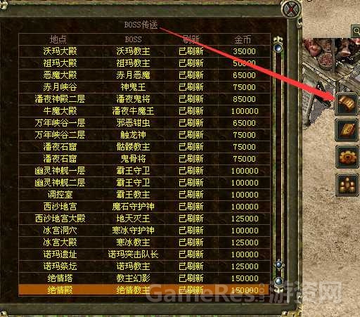 1.更换boss刷新界面,现在选中对应行可直接花费金币传送