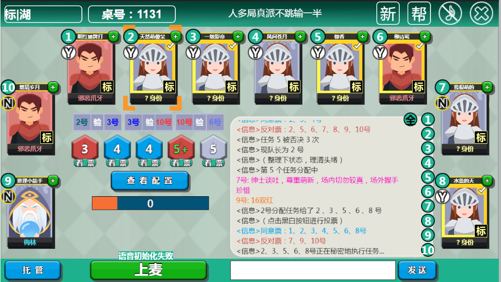 从1号位参与者开始作为首轮队长,指定数名成员入队,然后由所有参与者投票这个队伍是否通过(是否允许执行任务)。