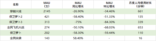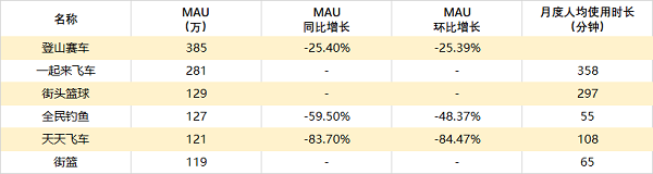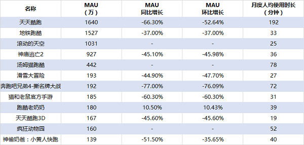 今年入榜的产品一共12款,相比去年减少10款;MAU总和6783万,相较去年同期的1.1亿减少近一半。领头羊《天天酷跑》的MAU减少或许是是主要原因。