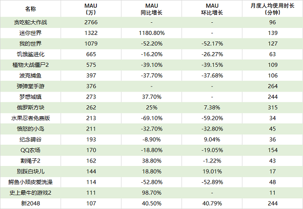 其中,《贪吃蛇大作战》以2766万的MAU冠绝群雄,打破了去年休闲游戏没有破千万产品的记录,而《迷你世界》、《我的世界》都突破了千万MAU,对于想要靠小而美的产品策略图为重度游戏的厂商而言是个利好消息。