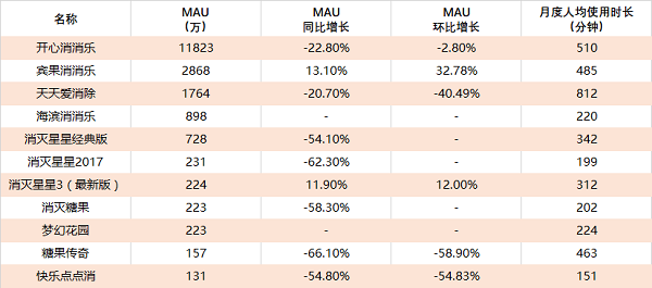 余下的消除游戏MAU呈减少状态,特别是消灭星星品牌繁多,多家公司运营,造成了一定的玩家认知混乱,在今年都有表现差强人意。