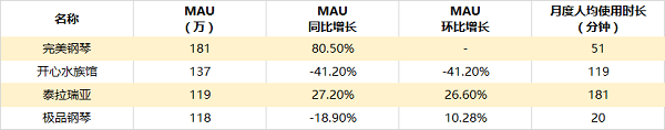 《完美钢琴》和《极品钢琴》便是两款钢琴键盘模拟器。其中《完美钢琴》快速增长,以同比80.5%的增速达到了181万的月活跃用户。