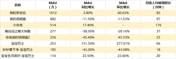 在表格中,只有《滚动的天空》和《疯狂动物园》两款新入榜产品,而唯一在老产品中MAU没有下滑的是《跑酷老奶奶》,仍然保持了10%的同比增长和环比增长。其余成功产品因生命周期等现实原因,均有不同程度的下降。
