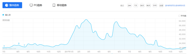 与当年的三国杀退潮相似,无论是线下的狼人杀吧还是在线狼人杀App,都已经进入了冷静期与退潮期。从百度指数来看,狼人杀在去年元旦后爆发,至3月寒假结束回落,6月暑期开始再度火热达到次高峰,并开始了连续半年的下降走势。