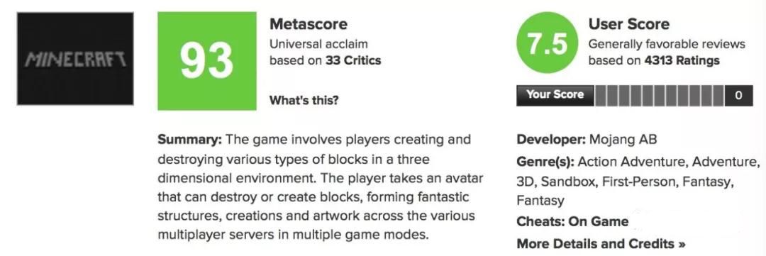 不仅销量惊人,自上线以来,这款游戏的口碑也处于极佳的水平。《我的世界》PC版在metacritic上拿到了33家媒体评价均分93分的大好评,玩家评分也高达7.5分。