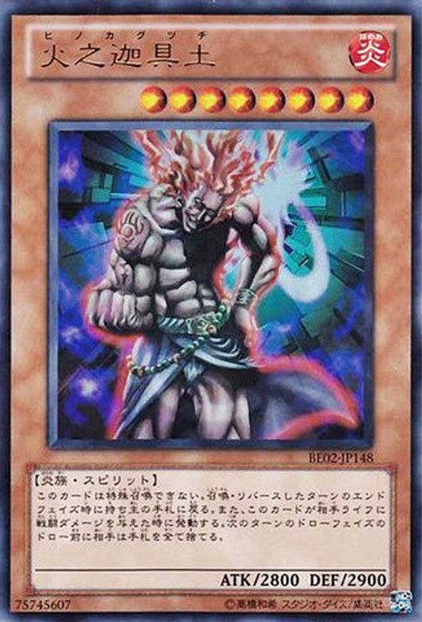 传说伊邪那岐(也叫伊奘诺尊)和伊邪纳美(也叫伊奘冉尊)是日本的父神和母神,是他们创造了日本,并生育了各神。(伊邪纳美其实是伊邪那岐的妹妹……)但是不幸的是伊邪纳美因为生产火神——火之迦具土而死。伊邪那岐悲痛万分,用十拳剑杀死了火之迦具土。《游戏王》中有一套以日本的神怪传说为基础设计的“灵魂系列”卡牌,它们的共有特性就是在回合结束时会重新回到手牌。灵魂卡中的火之迦具土的形象就很“风骚”。