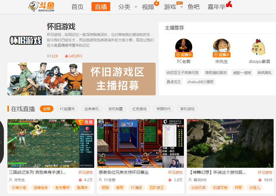 斗鱼直播平台致力于打造多元化游戏直播平台,此次怀旧游戏专区的引人注目,正式拉开了经典游戏的全民娱乐大幕。现如今面对新鲜事物的层出不迭,人们有了更多转移注意力和放松休闲的方式,从食物、电影、生活到游戏等,怀旧已经成为了现下时代的一种时尚。斗鱼于4月12日正式开启的“头号玩家 致敬经典”活动,除了为水友提供经典游戏直播,也开启怀旧主播招募活动,助力其成为头号玩家,为经典灌注新鲜血液。
