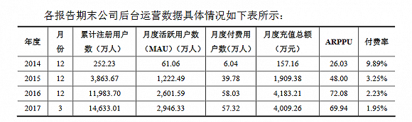 巨资宣传带来的人气非常可观,积累了大量的用户资源。同时数据表明,推广期间MAU与月付费用户数也表现出一定的联动性,在2016年7月至8月、2016年12月至2017年2月这两个时间段内,MAU与月付费用户数增长明显。
