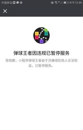 记者发现此前在微信中非常火爆的小游戏《弹球王者》因涉嫌侵权暂停服务。提示页面显示小程序弹球王者由于涉嫌侵犯他人合法权益,已暂停服务。