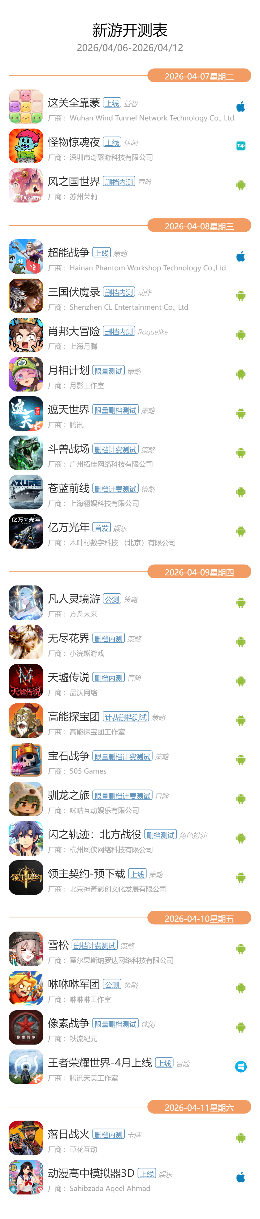 GameRes游资网统计了2026年4月6日—2026年4月12日的最新手游开测信息,共有23款游戏开测。以下是开测信息: